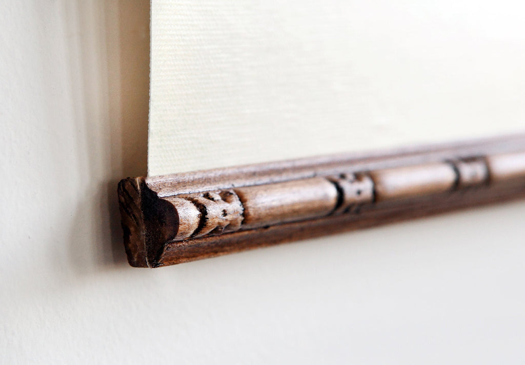 Each hand restored map is printed on heavyweight 23 mil Epson Exhibition Satin Canvas using a 12-color Canon Pro 4100 printer, which ensures vivid colors and sharp detail. The canvas is treated with protective elastic polymers to resist fading and damage over time. Decorative wood pieces stained and varnished are attached at the top and bottom, featuring two eye-hooks for easy hanging. A jute rope twine is included to complete the vintage scroll look.